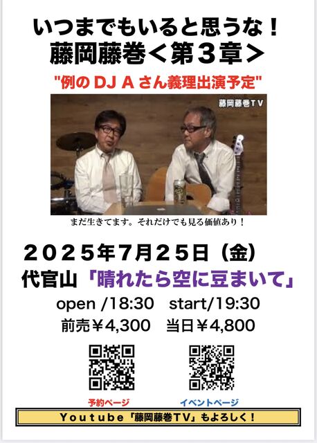 2025年05月27日 [終了] 7/25(金)は代官山で藤岡藤巻とあの人のライブです! なんかね、東京っていう都会に、代官山っていうオシャレな街があるんですって。もちろん山の上にあるわけじゃなくて、代官山って言ってもサンダルで行ける平らなとこです。そんで、そこに「晴れたら空に豆巻いて」っていう妙な名前の店があって、そこで藤岡藤巻っていう名前の、いや苗字の..うんと苗字+苗字のめっぽう面白いバンドが出るらしいんですよ。有名なDJもイヤイヤ参加してくれるらしいんです。こりゃ、みんなしてイヤイヤ集うしかないですよ!! ねっ、みなさん、イヤイヤ行きましょう!! イヤイヤ参加して楽しいライブなんて藤岡藤巻だけですから! タグ :#藤岡藤巻#ライブ